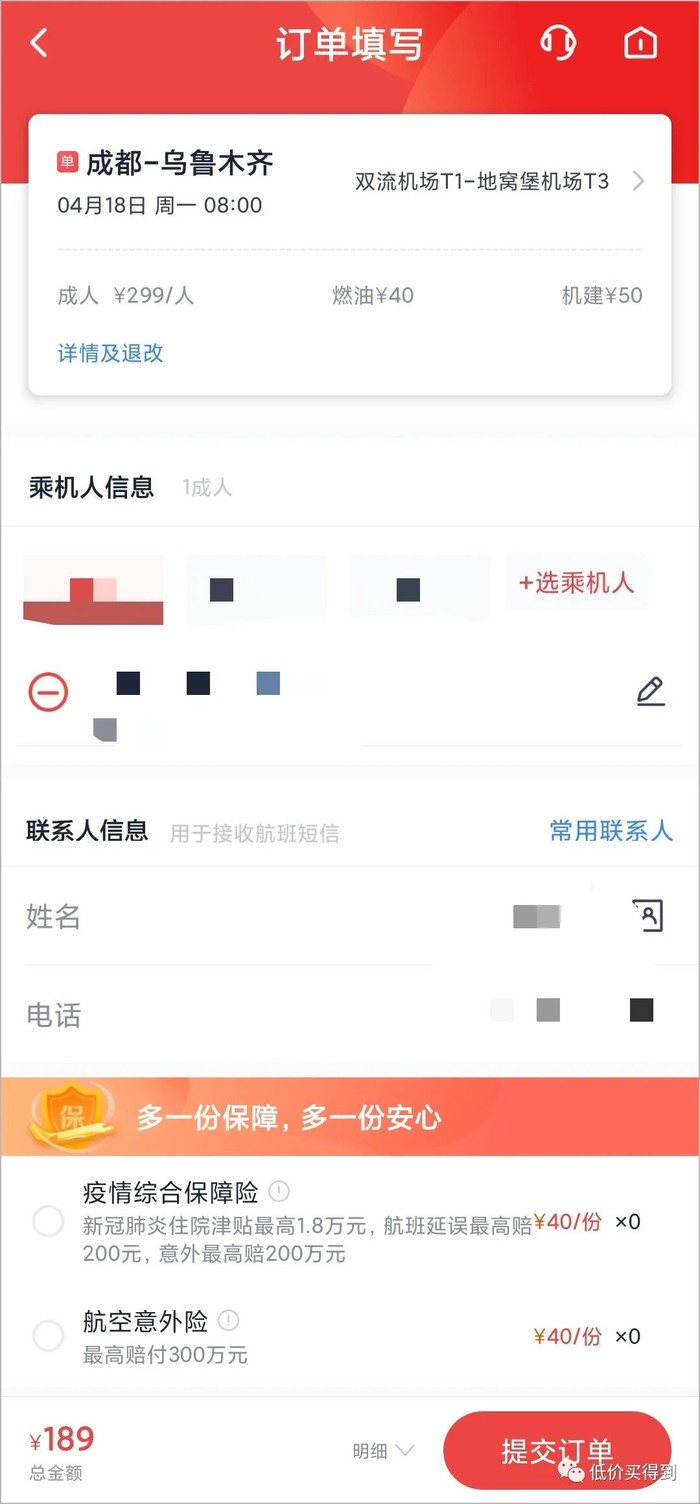 比如成都飞乌鲁木齐单程,会员日特价299元(含税389元),叠加全国版安逸飞优惠券(200元券)后,票价仅99元(含税189元)。
