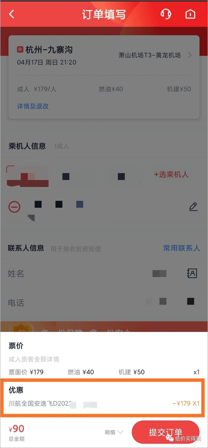 又比如杭州飞九寨沟单程,会员日特价179元(含税269元),叠加全国版安逸飞优惠券后,票价仅0元(含税90元)。