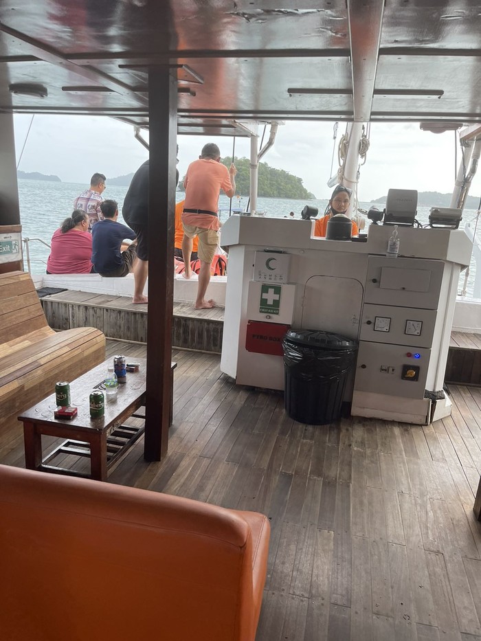 一个小时后雨停了,也要返航了,气氛已经没有刚开始热烈了,大家三三两两地坐着,快上岸的时候船上有个他们公司的高层出来讲话,说"虽然没能看到日落但是这是天气的问题不是服务人员的问题,他们都很热情,也把大家安全带返航了,希望大家能给小费。"