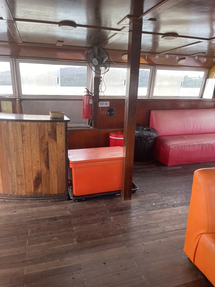 我的这趟船大概三十多个人,其实有点诧异,看到别家的船大概都是十几个人而已的。船是双层的,底下两个厕所一个换衣间,整体比较旧,工作人员很多大概十几个,很热情,帮忙拿酒,会问要不要拍照之类的。