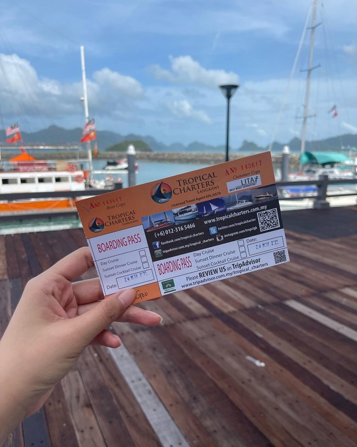 按摩结束三点半的样子去还我的小摩托,我最期待的落日巡航环节就要来啦!因为一向比较在旅行前把能定的项目都定好,所以这次我也是在Cuti的App上面定了Tropical这家的船,但是…我的建议是到了兰卡威再定吧,满条街都是广告随便哪一家都能定,而且淡季价钱都能谈的会更便宜,当然啦,旺季估计还是提前定比较好,人还是挺多的。