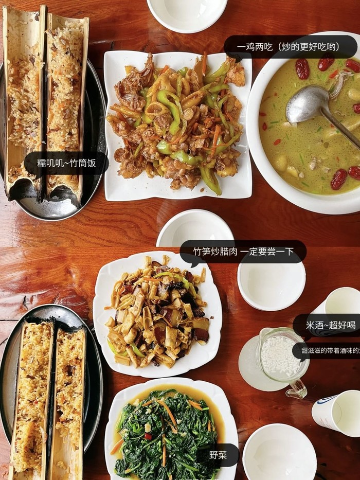 民宿可提供,人均80+本地的特色菜(图7),竹筒鸡、炖鸡、炒鸡、竹筒饭、野菜、干笋腊肉、米酒...都好吃