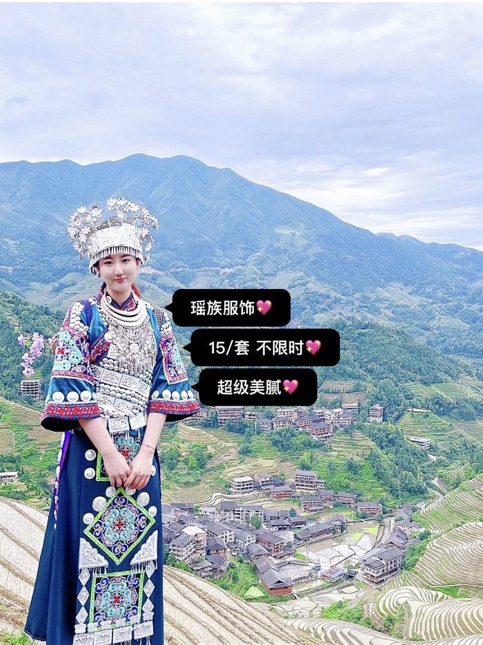 观看日出日落的位置,不光能看到很多层的梯田,同样也有很多层的观景台,而且可以租到瑶族的服饰,一定要租一套,超级出片(图4),10~15/套,要讲价哟~