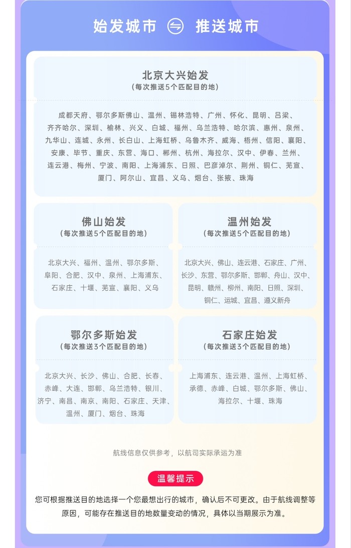 可选北京、佛山、温州、鄂尔多斯、石家庄出发,目的地随机推送,看到想要的目的地就可以兑换机票。可能随机推送目的地的范围看大图。