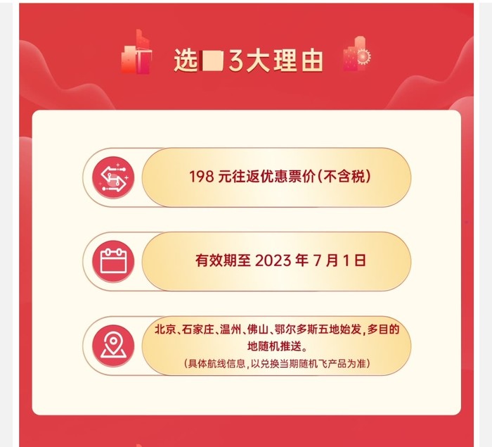 拿到盲盒兑换券后,兑换“中国联合航空随机飞”机票盲盒(最迟2023.7.1兑换“随机飞”),然后兑换机票。