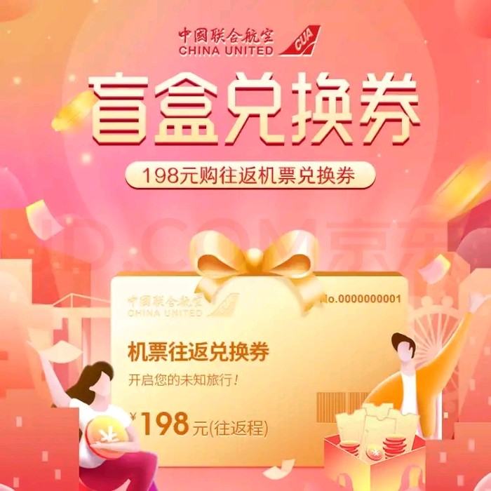 中国联合航空“盲盒兑换券”,198元每套,可以兑换一套往返机票。