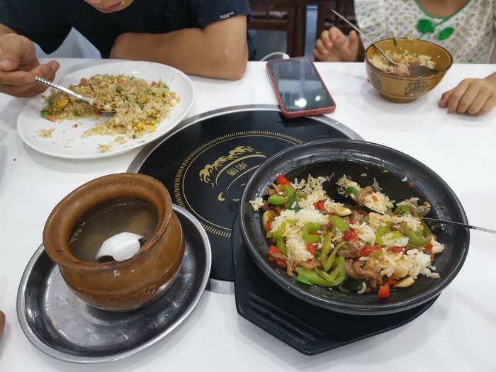 走着走着就走到了当地最繁华的人民广场,瞅见一家煲仔饭看起来不错,于是点单,天哪,一个牛肉煲仔饭竟然有那么多牛肉,饭都吃完了,肉还没吃完,老板真实在!扬州炒饭也很好吃。