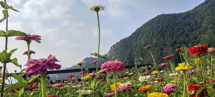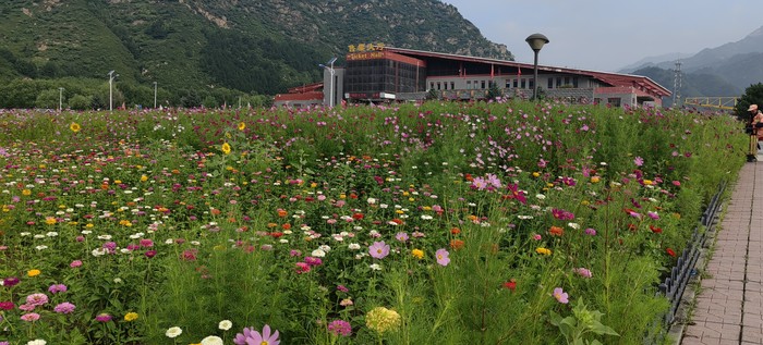 和朋友一家约好周三网上约车位,周六早晨6点出发,一路高速,大约2个小时就到了。山脚下都是鲜花,五彩斑斓的,看着人很多,车也不少。
