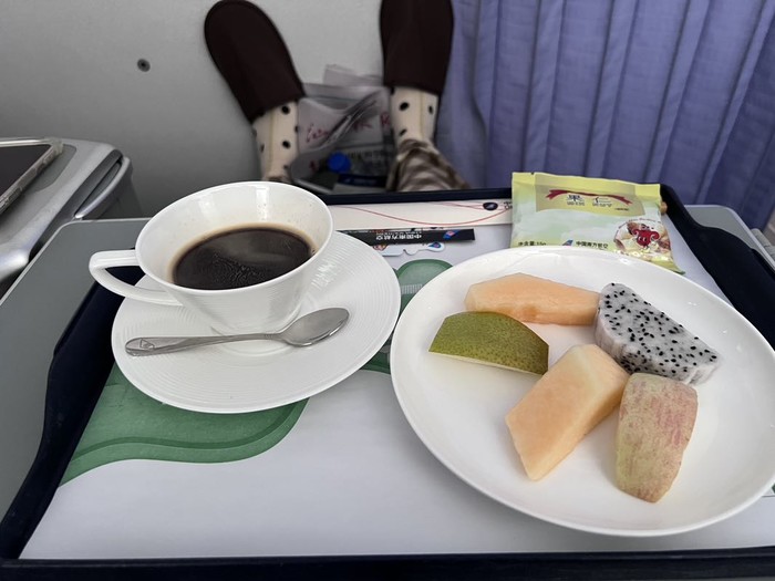 今日份头等舱(有水果拼盘 果汁还有长沙大包子) 16:45下飞机 到酒店就得17:45 等小伙伴一起去吃晚饭啦