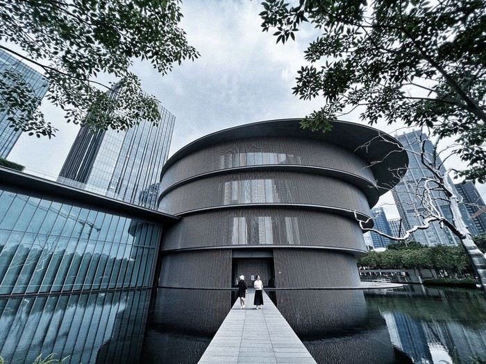混凝土、光、水、风相互融合在一起恰到好处,这座具有岭南建筑文化意境的美术馆,传承了中原古建筑中的"天圆地方",也是象征性纯几何学立体的交错而创造出具有岭南建筑文化特征、呈现光影礼赞的建筑风景。