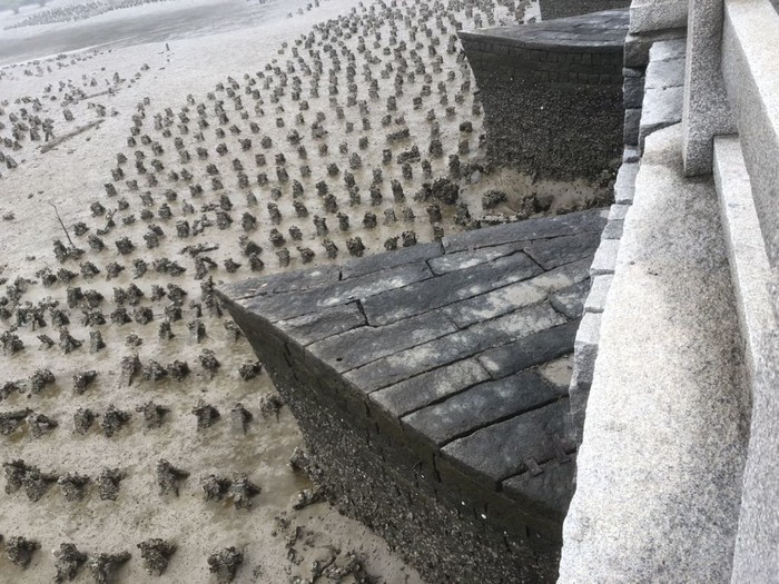 桥墩两头尖,以分水势,减轻浪涛时桥墩的冲击。桥墩上缀满白色蛎房痕迹。对古人的建桥技术非常佩服。