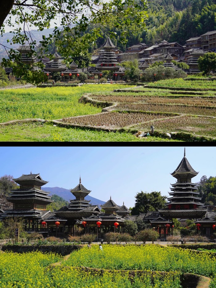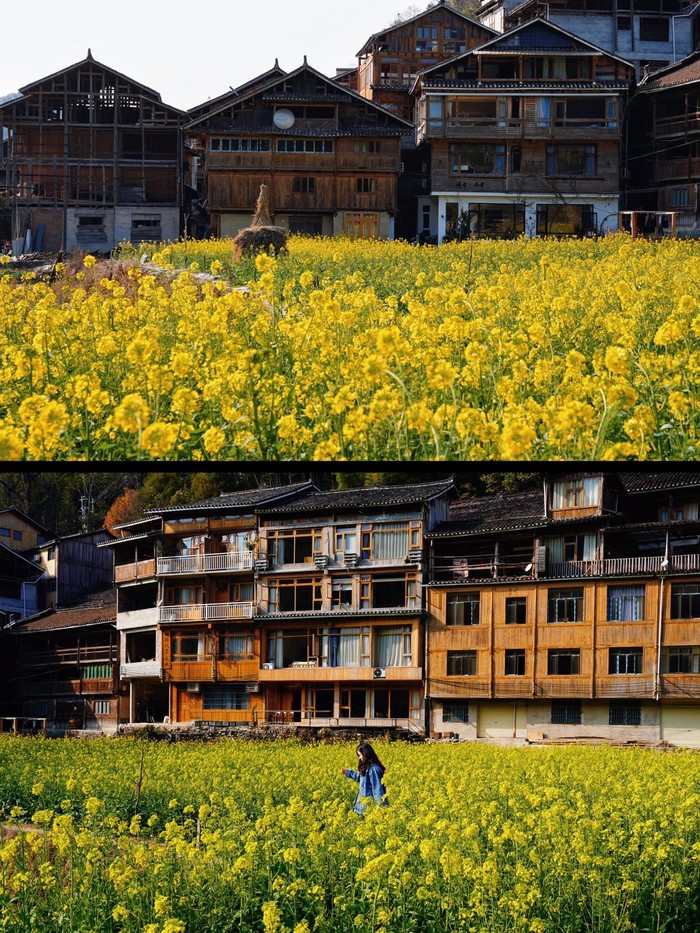 ②油菜花田:一是上述寨子大门处,二是侗寨主街往后走,穿过所有房子后有大片的田,这里还有一处油菜花田。