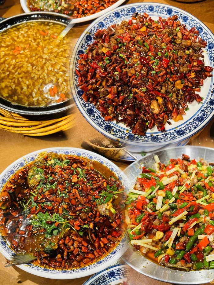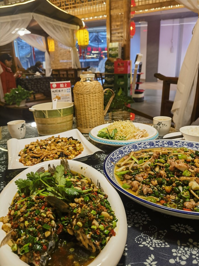 悠闲得逛完,已经16:00,打车回到酒店附近觅食到了一家名为“凤驿来凤鱼壁山兔”的店,可能到的太早,店员厨师都在打麻将,看到我们还是热情招呼,厨师立马放下麻将,麻溜的炒菜,抄完又回到牌桌。我们点了尖椒壁山兔、鲜椒鲫鱼、鱼香肉丝和鸡丝凉面,尖叫壁山兔是招牌菜,很好吃,但值得一提的是重庆的鱼香肉丝和我认知内的完全不同,却出乎意料的美味。