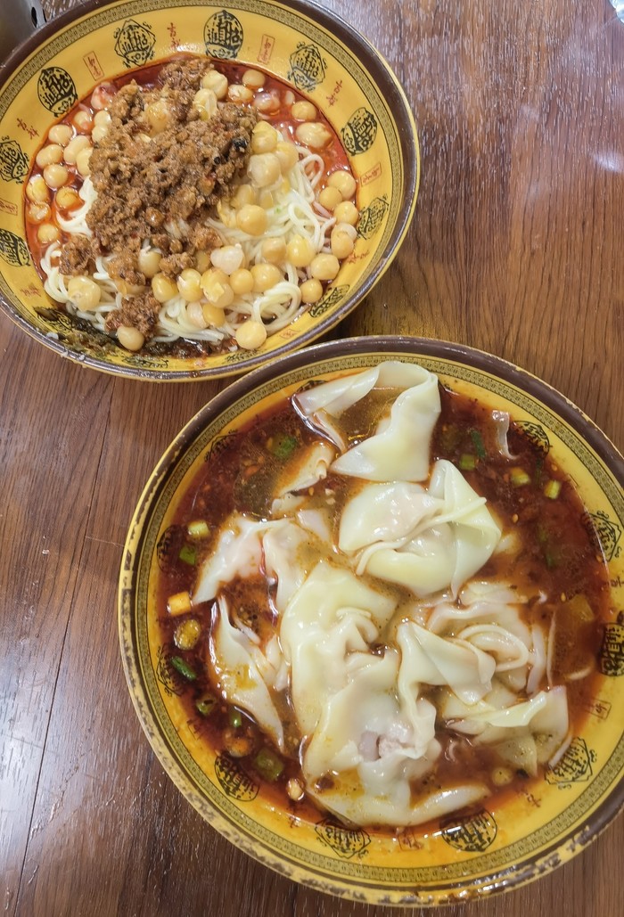 由于第三天醒来又是10点了,且有些小雨,直接饿了么叫了两把伞。去酒店对面的巷子里,吃了豌杂小面和红油抄手,不起眼的小店,味道已然很正。