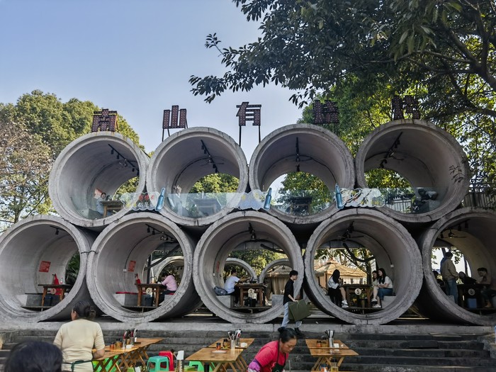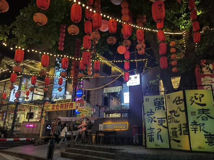 20:00晚饭后,我们决定去逛逛【观音桥】,是从鲤鱼池站坐9号线地铁去的,结果就后悔了,从地面到坐上地铁,经过了7个手扶电梯,每个手扶电梯还特别长,几乎下到了地下十几层才坐上地铁,却只坐一站,其实换步行的话走都走到了。【观音桥】完全只是热闹的商业街,我们一路散步消失,由闹至静,逛到了一处名为【北仓文创街区】的地方,有一些别致的小店和清吧。走出这片街区右转,来到【九街】,满大街都是小哥哥拉你去酒吧或夜店,感兴趣的可以尝试。