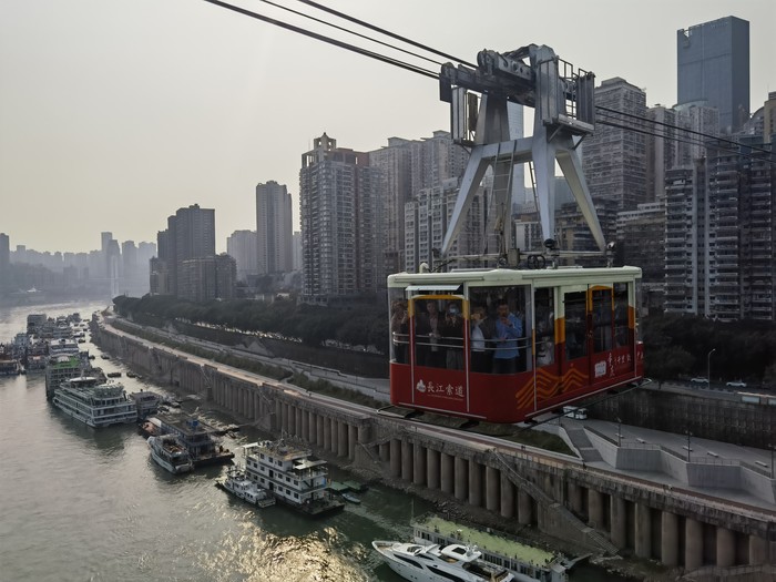 随后沿着【南滨路】,步行至【长江索道南站】。乘坐长江索道,可以在“长江索道”微信公众号购票,单程20元。当时北站排队人数显示497人,南站排队人数97人,所以我们才坐地铁过来从南站坐回北站。但还是排队了半小时。在索道上看到了密密麻麻的白象居,很多人在那打卡拍我们的缆车。