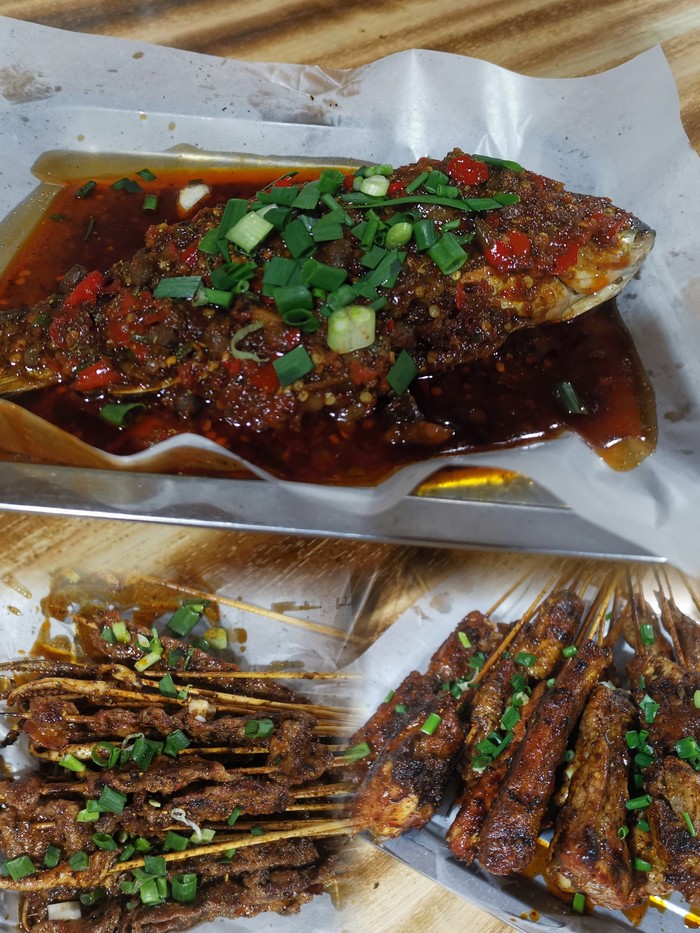说回这家烧烤店,因为是真碳烤,所以比较慢,老板建议一次性把要吃的都拿上,我们点的量很大,等了大概半小时才吃上。但这样的等待让食物更美味!尤其是他家刷在烤串上的灵魂酱料,味道爽快又美味。建议和老板提前沟通蔬菜要留着串,不然当地人是拆了蔬菜的签子混在一个盘子里的。