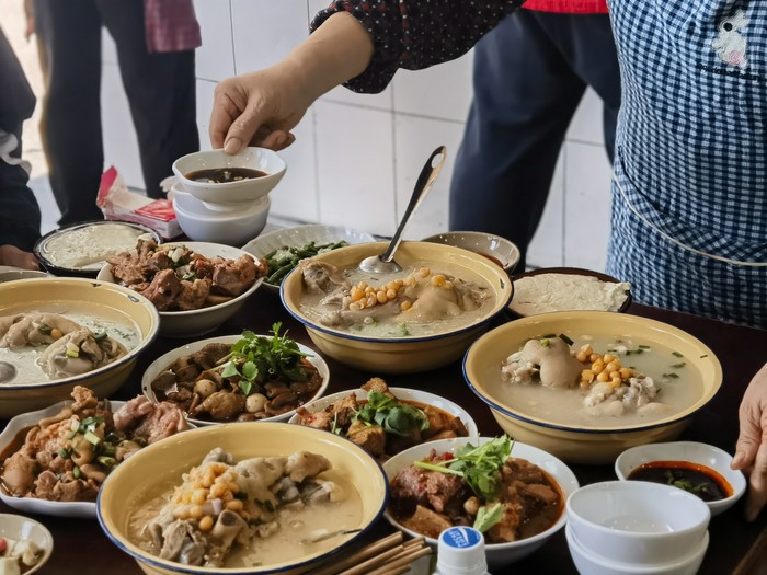 10分钟后,叫了专车直接抵达【涂鸦一条街】的“胡记蹄花汤”,很小的店铺,门口排起长龙,但翻台很快,没多久我们就坐进店里了。蹄花软糯,汤底鲜美,值得打卡!还有红烧口味,老板极力推荐。同行伙伴点了肥肠,也评价颇高。