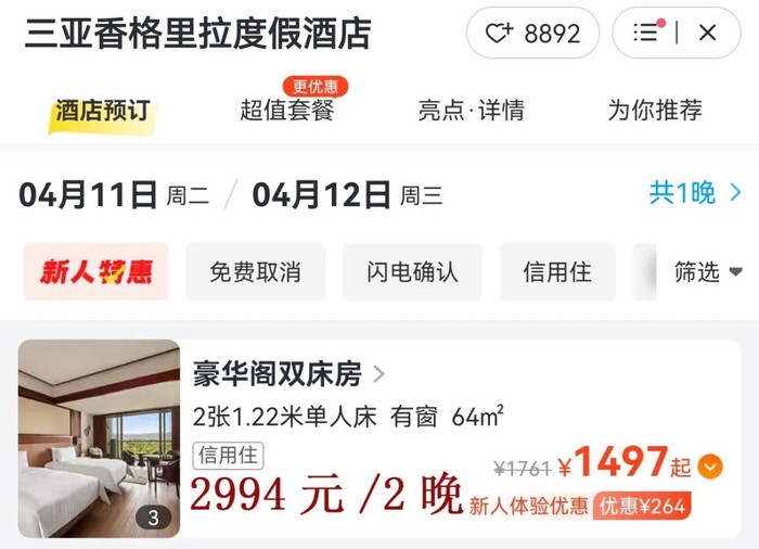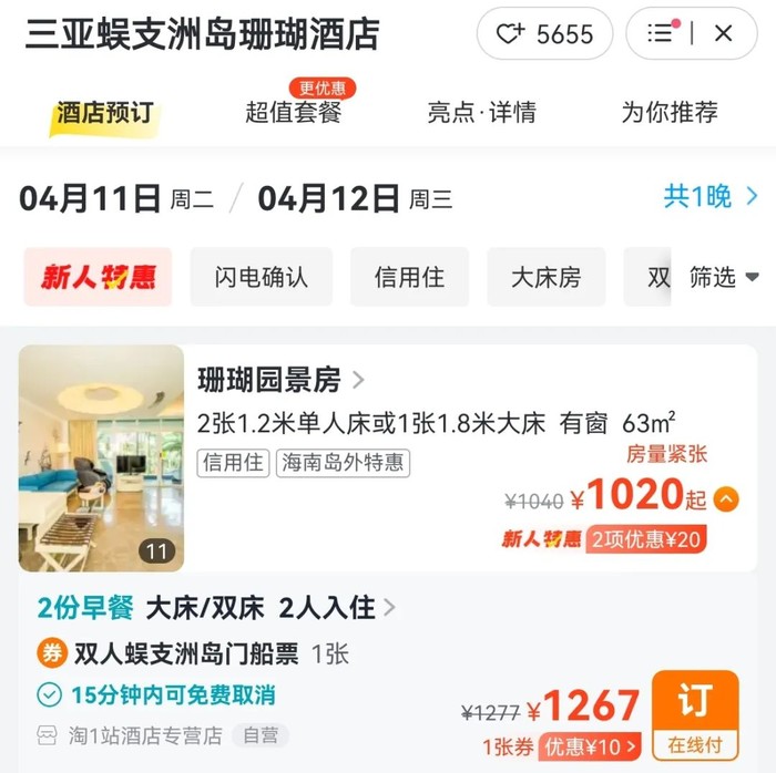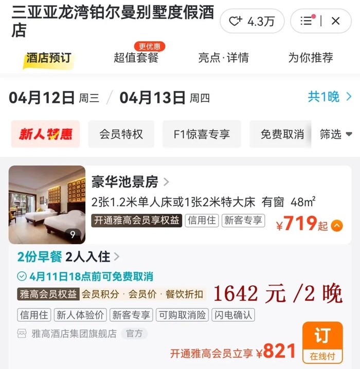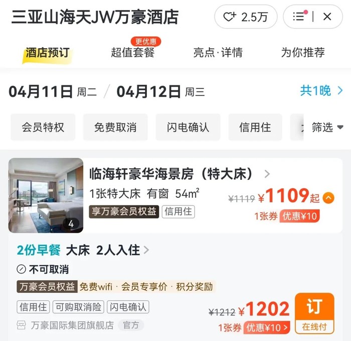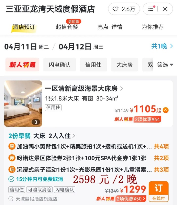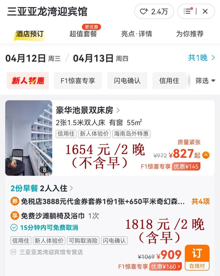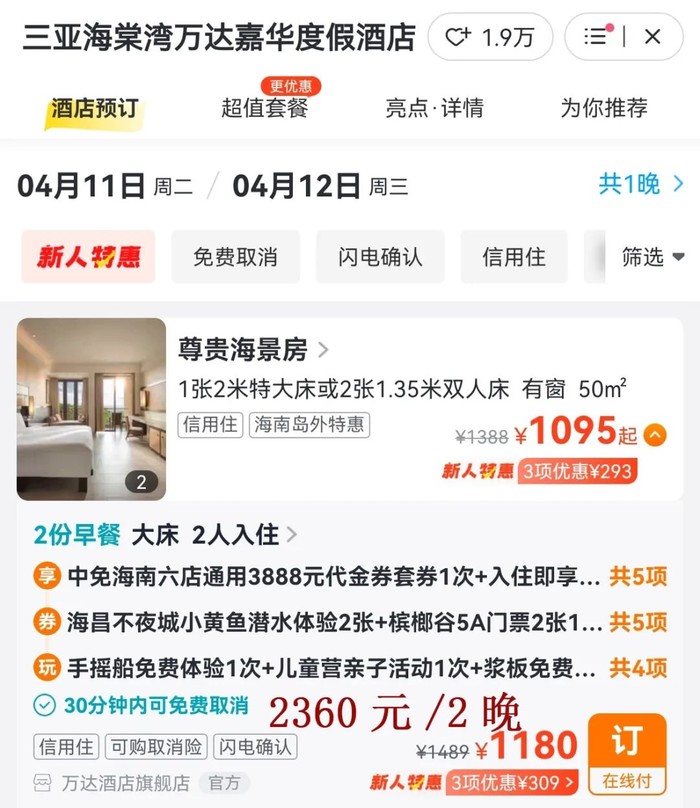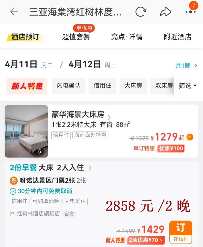 日历房2晚含早2360元,套餐2晚含早+双人晚餐1499元,算下来差不多是5折的力度,最重要的是周末、五一不加价,建议五一要去三亚的一定要囤!五一酒店价格有多离谱,大家应该都有所耳闻。