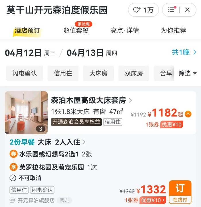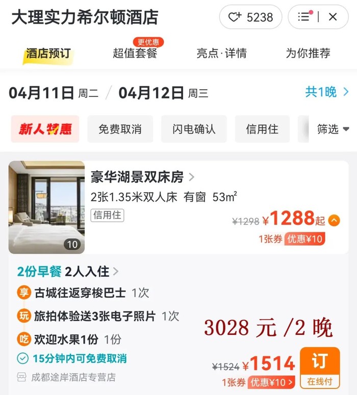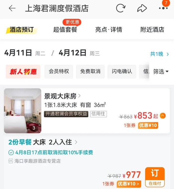 日历房1晚含早977元,现在购买套餐2晚才990元,基本上是买一晚送一晚的力度了。