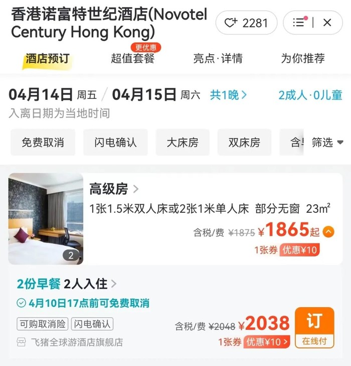 日历房1晚含早2038元,而现在套餐2晚才1388元,几乎打了3.4折!而且套餐还额外赠送午餐或晚餐,香港消费高,这个得值好几百块了!不约可退,必须冲!