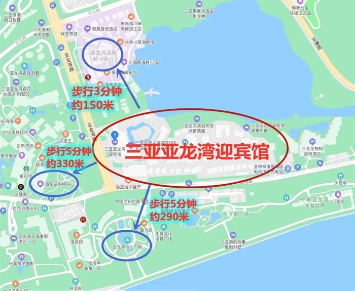 酒店位于亚龙湾度假区的核心位置,近购物中心近沙滩,吃购娱非常方便,具体可参考下图。