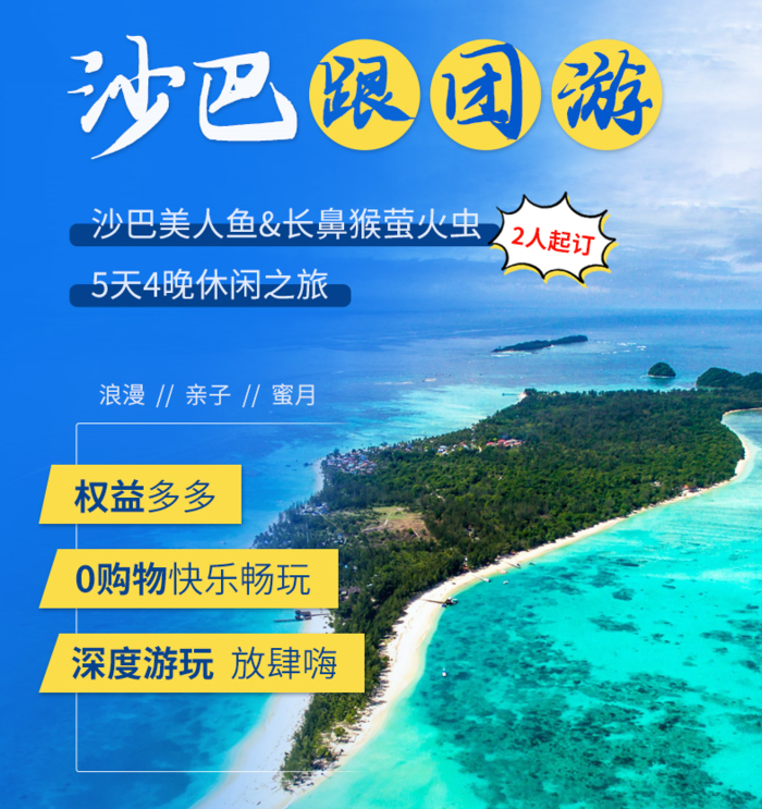 【1】沙巴美人鱼岛长鼻猴萤火虫3天2晚/5天4晚+美人鱼岛一日游+2个浮潜点+香蕉船+长鼻猴萤火虫生态游+全年不加价+全场0购物,999元起