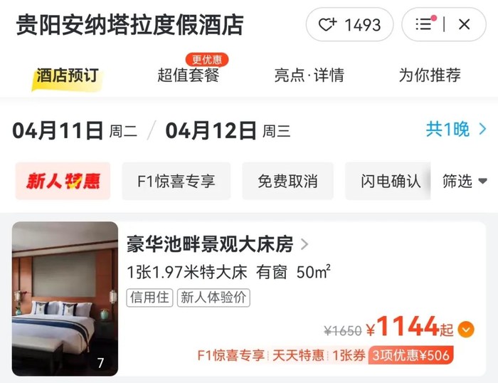 日历房1晚需1144元,购买套餐立省366元,打了约6.8折!而且套餐可免费升级房型(3.31前入住酒店,视入住率情况),周末不加价,非常适合贵阳及周边的朋友们囤一份留着度假用。