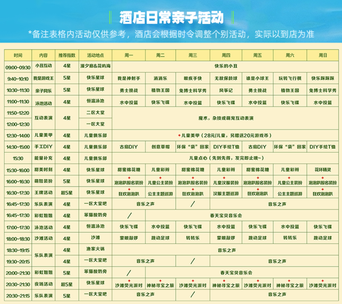 酒店的泳池、亲子、康乐设施一应俱全。儿童浅水区自带沙滩,超1200㎡的室内外儿童乐园让娃尽情耗电!亲子活动也是非常丰富,有大娃喜欢的滑索、射击,也有小娃喜欢的画画、手工等。