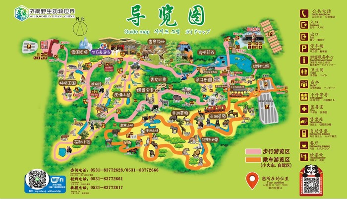 附上园区内导览图,可关注济南野生动物世界微信公众号,左下角位置会有AR导览,看好路线再出发吧。
