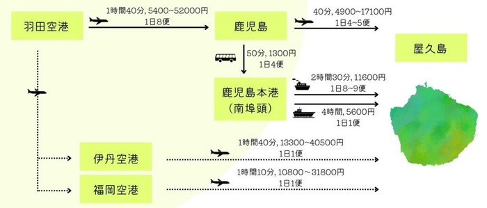 一种是直接坐飞机到岛上,另一种是先到鹿儿岛市,然后再坐船到屋久岛。