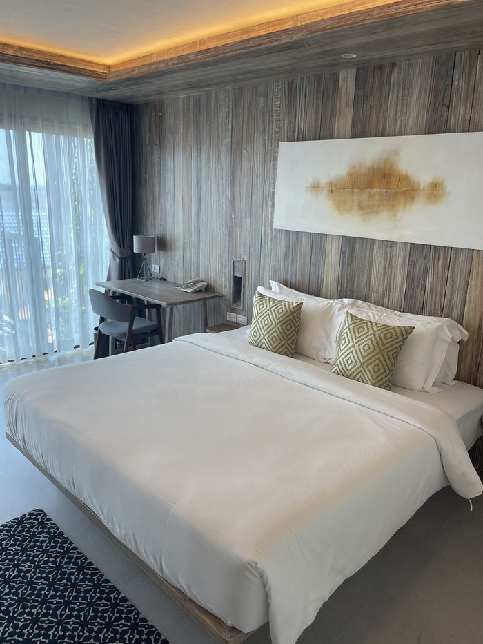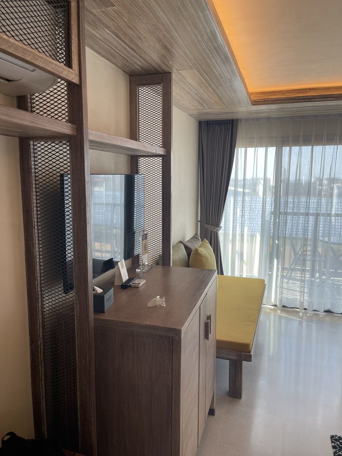 到达酒店的时候才12点,还不能check in,酒店在芭东区,但是不靠海,离酒吧街走15分钟左右。大堂超级舒服,四面微风徐徐,瞬间海岛度假氛围感拉满。房间也比我们预料的大很多,很有feel。