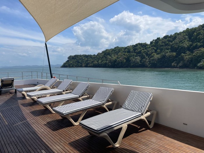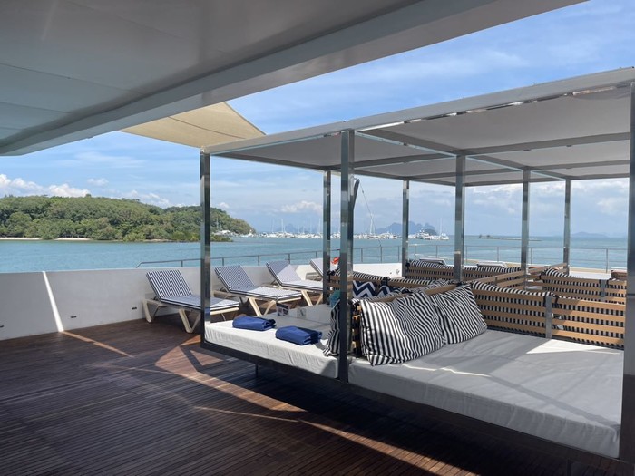 船上设施真的很好,座位也是提前分配好的,一张桌子4-8人不等,上船就有小饮料,等出了码头救生衣脱下来就可以自由活动了,一楼的前面是沙发床,二楼都是躺着的,很惬意。