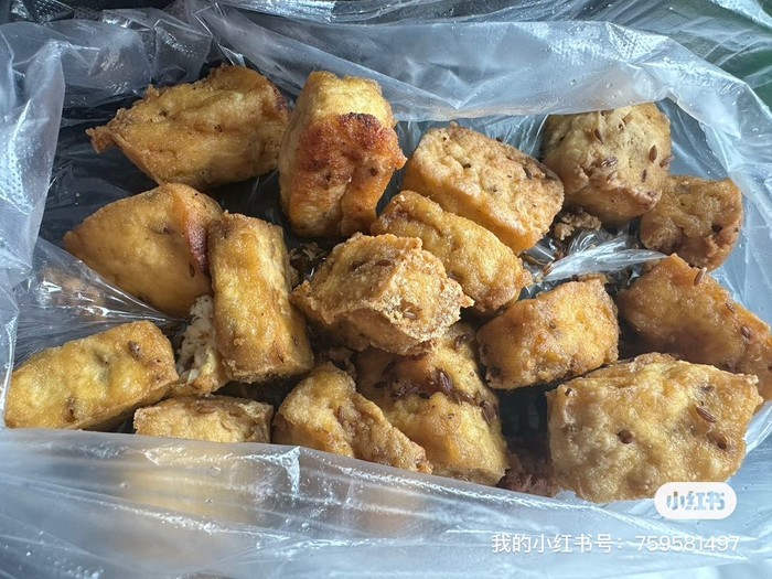 10元的孜然豆腐是比图片上的多的 大概还剩下五六块钱的 因为太好吃了 我们走着吃着走着吃着 拍照的时候就剩下这么多了