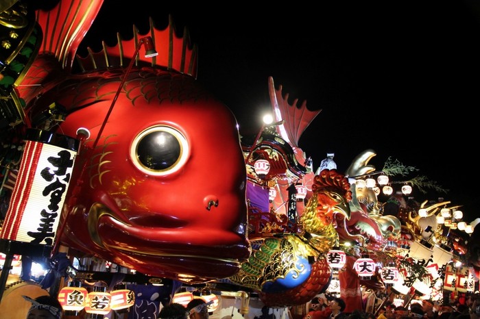 祇园祭在日本历史悠久,其目的是为了祈求防疫、地区繁荣和五谷丰登。在唐津诹访神社举行的“浜崎祇园祭”是具有250多年历史的夏日祭典。当天不仅会有壮汉托举山笠游行的队伍,还会有很多小吃摊,晚上灯光璀璨,非常热闹。