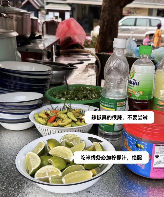 这个是一个老城当地居民区巷子口的摊,我们就瞎点了一通,也不知道叫什么,味道都还可以,除了木瓜沙拉,都是第一次吃的味道。这个拌米粉里面放了炒米,还挺特别的的,湖南人表示,不要小瞧辣椒酱,是真的辣。