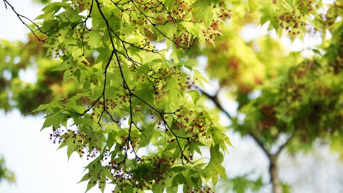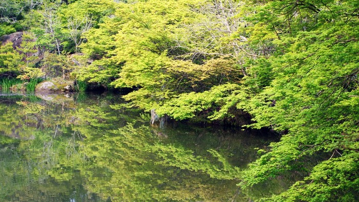 等到初夏的时候,平静的湖面和春芽新发的嫩叶交相辉映,犹如翡翠般油亮。