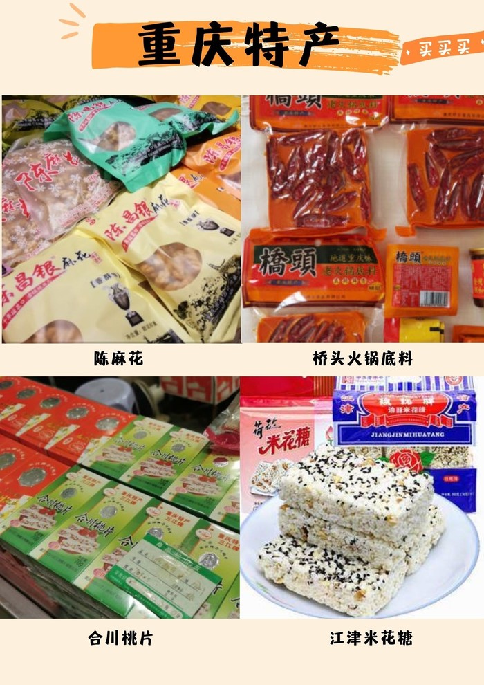 特产的话,我打算带点陈麻花、桥头火锅底料、江津米花糖、合川桃片、武隆羊角豆干大家帮我康康这份攻略如何呀?还有其他好吃的推荐吗?