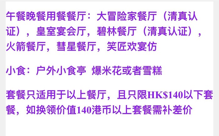 4、二合一餐券:体验一餐足够了,是套餐+小食摊爆米花/冰激淋;可再尝试下火鸡腿,在小食摊卖,个头大于上迪(180港币火鸡腿+可乐套餐)