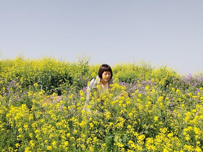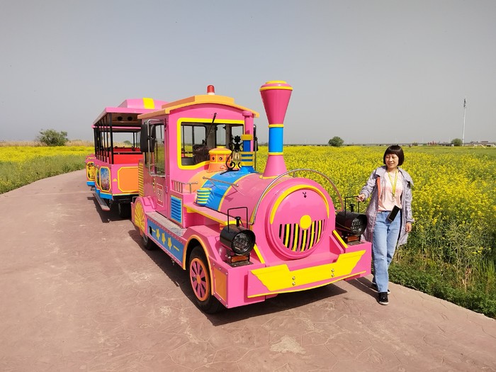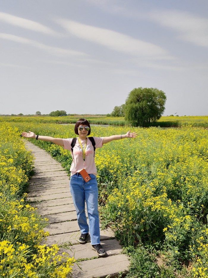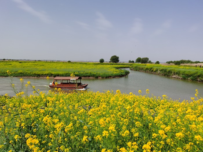 第二天一早前往湖上花海,看高邮湖上万亩油菜花。虽然3月底是最好的季节,这个时候花有些凋落了,但还有不少盛开的,让人惊艳它的执着。游客可以自费选择小火车或者乌篷船进出,毕竟景区太大,不能全靠步行。乘坐艳丽的小火车穿行在花海中,金黄色的油菜花向我们挥舞着手臂,热情地欢呼。
