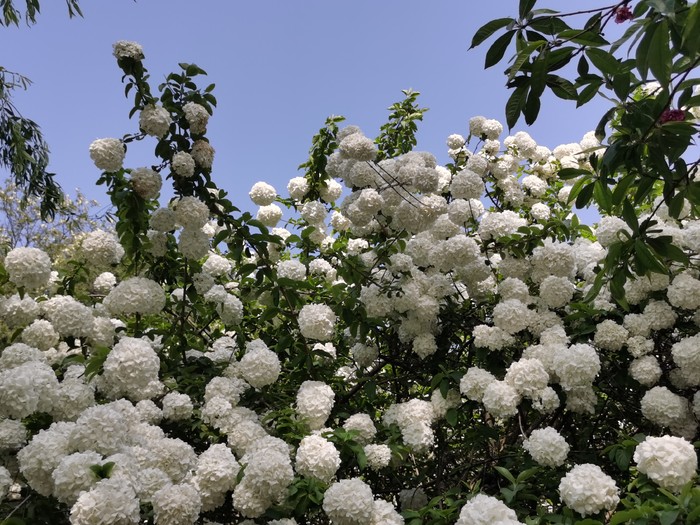 你一句春不晚,我就到了真江南。进门不远处那一片洁白如雪吸引了我的注意,是团团簇簇的绣球在盛开,蓝天为底,绿叶相衬,白色无暇,让人忍不住想触摸。它们争先恐后地绽放,生怕落了后。