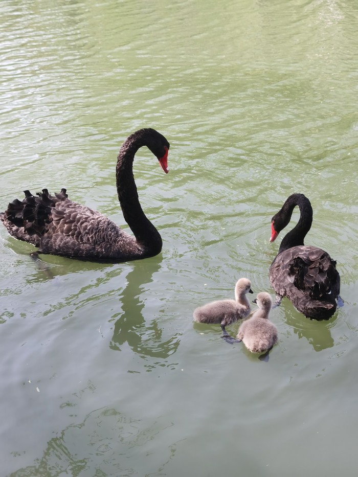 沿长堤看春柳,三步一桃,五步一柳,桃柳相间。春花缤纷烂漫,柳丝婀娜起舞,飞扬如烟。黑天鹅父母带着孩子在水边觅食,小天鹅毛绒绒的,胆怯地跟在父母身边。