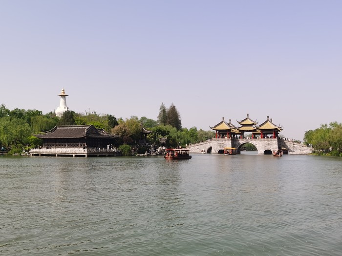 下五亭桥后前行,不远处便是二十四桥。汉白玉栏杆,如玉带飘逸,似霓虹卧波。唐代著名诗人杜牧的诗句“青山隐隐水迢迢,秋尽江南草未凋,二十四桥明月夜,玉人何处教吹箫”。诗因桥而流传,桥因诗而闻名。明明是个单孔拱桥,却称作二十四桥,不知道是因为古时有二十四个美人在桥上吹箫得名,还是因为这桥长24米,宽2.4米,栏柱24根,台阶24级,处处都与二十四对应这个原由。
