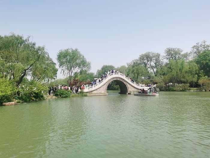出发!扬州的标志——瘦西湖,我们来了。瘦西湖南门外,旅行团大军陆续抵达,我们急忙快走几步甩开他们。进去一看,里面还是各种旅行团,天南海北,各种方言的人们汇聚在瘦西湖,都想抓住三月的尾巴体验江南的春色。
