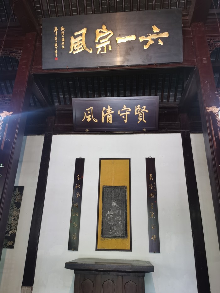 欧阳祠是纪念欧阳修在扬州的德政而建,中楹上悬 “六一宗风”匾,中楹北墙面南的墙壁上,嵌有欧公石刻像,刀工精致,石像传神,加之石面稍凹,造成光线折射,远看为白胡须,近看为黑胡须,且观者从任何角度看,石刻像的脸、眼、足始终正对观者,世称神品。