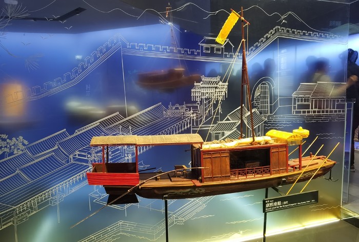 2号厅《运河上的舟楫》,以实体体验结合虚拟体验的方式,可在变幻的空间中了解运河船舶的演变、类型等知识,登上沙飞船站立船头,身临其境体验“迎亲”“唱戏”,领略运河四季,感悟运河带来的美好生活。