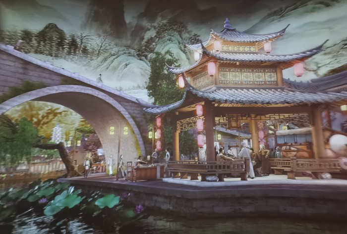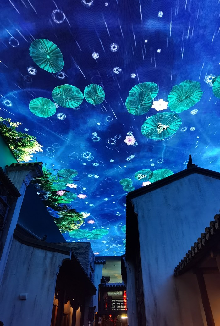 3号厅《因运而生—大运河街肆印象》,作为城镇历史景观的再现,如街道、酒店、商铺、码头、粮仓、戏楼、民居、牌坊等,呈现出大运河沿岸城镇商贸繁荣、百业兴旺的景象。脚下小桥流水、抬头满眼星空,一步一景,处处有景。有租借汉服的店铺,还包含整体造型,价格也适合,吸引了很多汉服小姐姐驻足拍照。