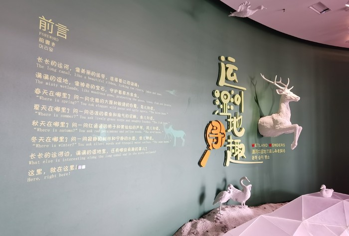 6号厅《运河湿地寻趣》,主要面向青少年,在“长长的运河、满满的湿地”板块中,有运河流经区域的自然风貌、生态环境、湿地概况、动植物种类等展示。
