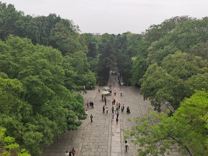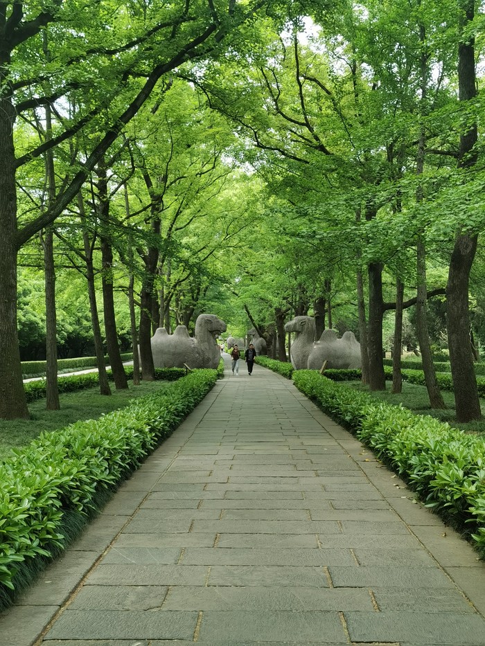 在音乐台休息片刻后,便乘观光车前往气势恢宏的明孝陵。道路两旁的梧桐树,参天向上,庄严肃穆。满目苍翠,郁郁葱葱,充满了勃勃生机。