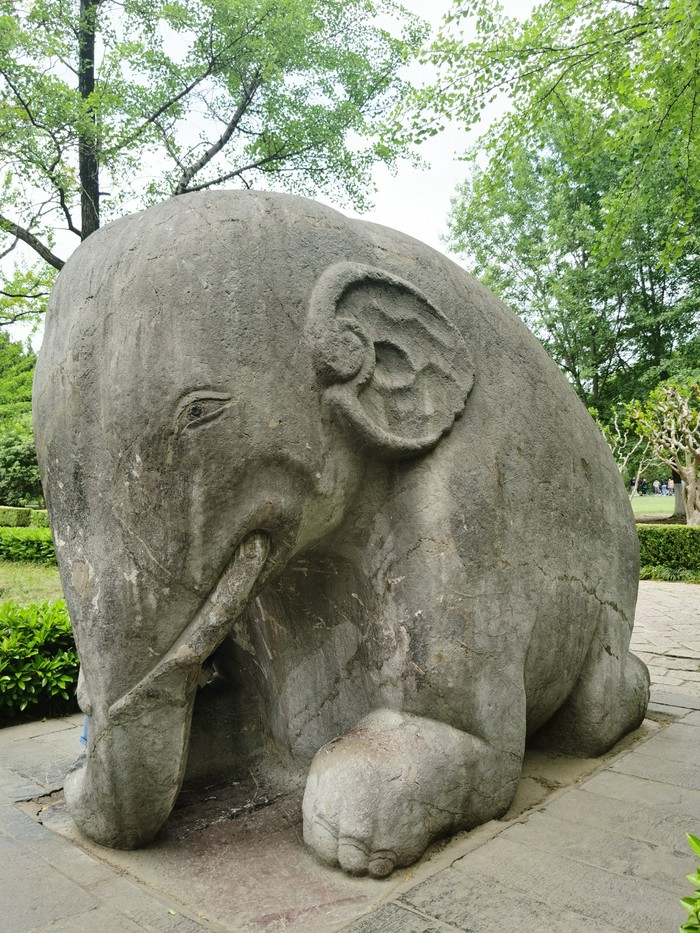 再往前不远便进入神道,明孝陵神道最大特点在于建筑与地形地势的完美结合。其不同于历代帝陵神道成直线形,而是完全依地形山势建造为蜿蜒曲折的布局。而且在每一段落的节点处安放石像生来控制空间,形成一派肃穆气氛。石像生下铺垫有完整的六朝砖,使其六百年来没有下沉。神道两旁依次排列着狮、獬豸(xièzhì)、骆驼、象、麒麟、马六种石兽,每种两对,共12对24件,每种两跪两立,夹道迎侍,气魄宏大,风格粗旷。